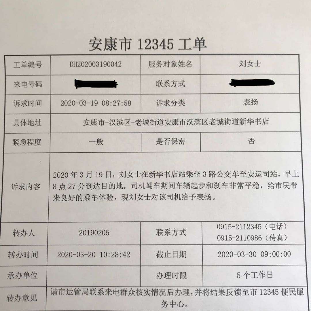 3路公交途經(jīng)地區(qū)路況復(fù)雜,客流量大,但駕駛員喻祥根師傅在當(dāng)班期間,用自己嫻熟的技術(shù)和優(yōu)質(zhì)的服務(wù)為乘客帶去了愉快的乘車體驗(yàn)。為此乘客劉女士特通過12345服務(wù)平臺(tái)表達(dá)自己的敬意。