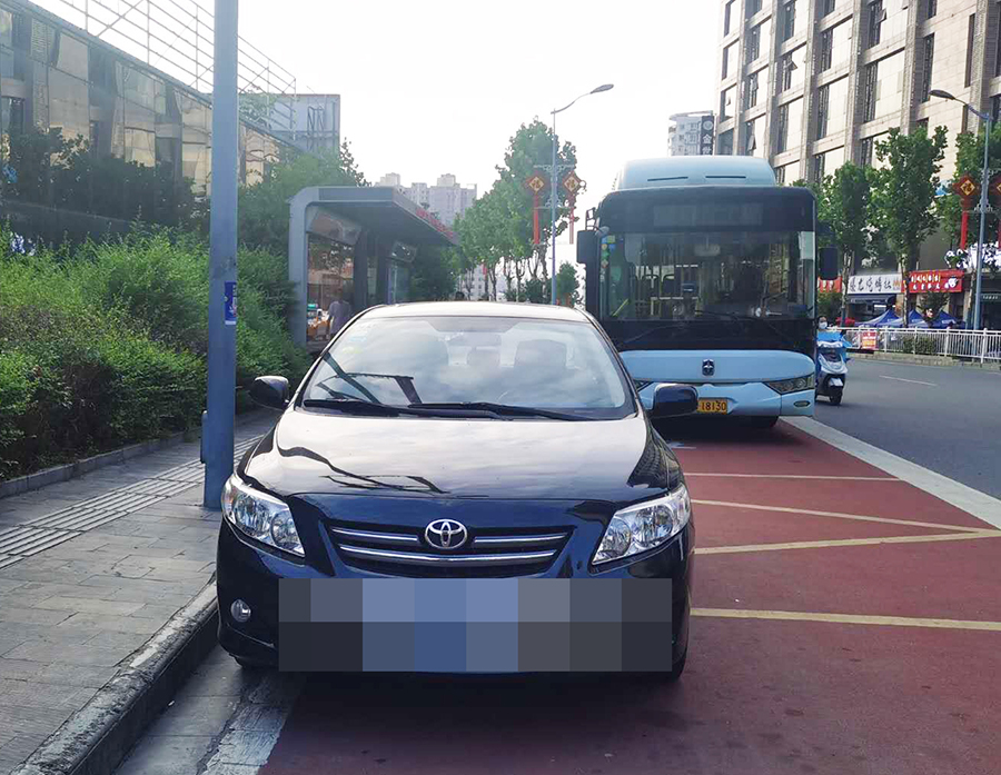 在金州廣場南站,十幾輛私家車“整齊劃一”的停在公交車站位置,地面紅色區(qū)域上的公交兩字也被完全覆蓋,從遠處望去,站牌旁坐著幾個人正等待公交車的到來。在興華名城站,一輛私家車??吭诠卉囌厩埃倎淼墓卉嚐o法按其規(guī)定進站停車。在西城閣站和漢城國際西站,幾輛私家車甚是“任性”,儼然將公交車站當(dāng)成了“停車場”,筆者在此駐足十幾分鐘,它們依然“紋絲不動”,有的車上甚至沒有車主。