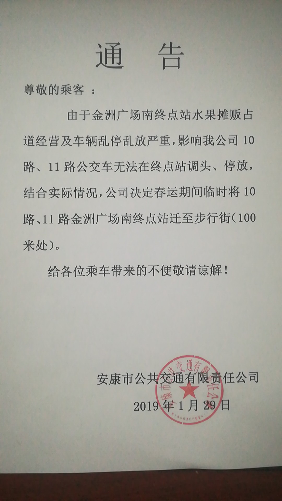 由于金洲廣場(chǎng)南終點(diǎn)站水果攤販占道經(jīng)營(yíng)及車輛亂停亂放嚴(yán)重,影響我公司10路、11路公交車無法在終點(diǎn)站調(diào)頭、停放,結(jié)合實(shí)際情況,公司決定春運(yùn)期間臨時(shí)將10路、11路金洲廣場(chǎng)南終點(diǎn)站遷至步行街(100米處)。